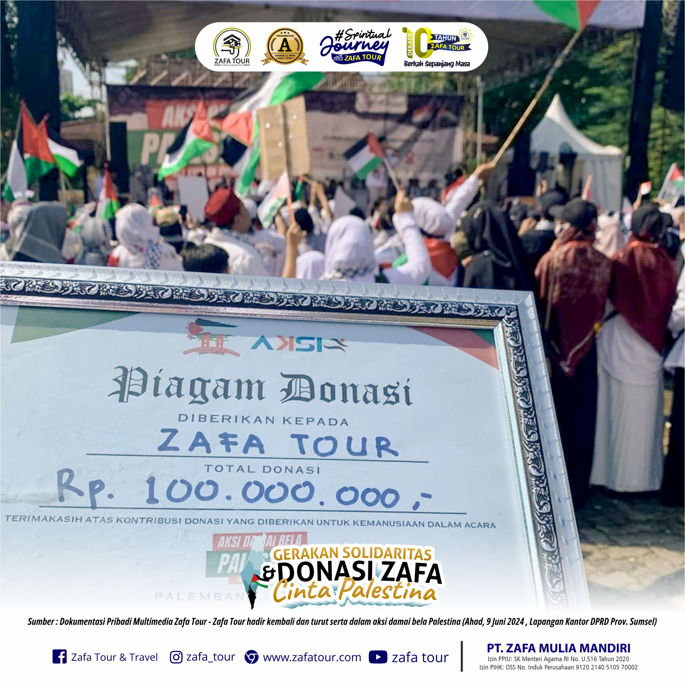 Zafa tour sebagai biro perjalanan jasa pelayanan Umroh dan Haji kembali ikut serta berperan dalam Aksi Damai Bela Palestina di Kantor DPRD Provinsi Sumatera Selatan pada Ahad, 9 Juni 2024.